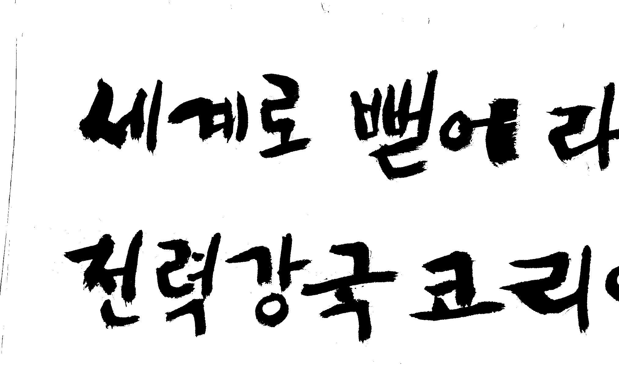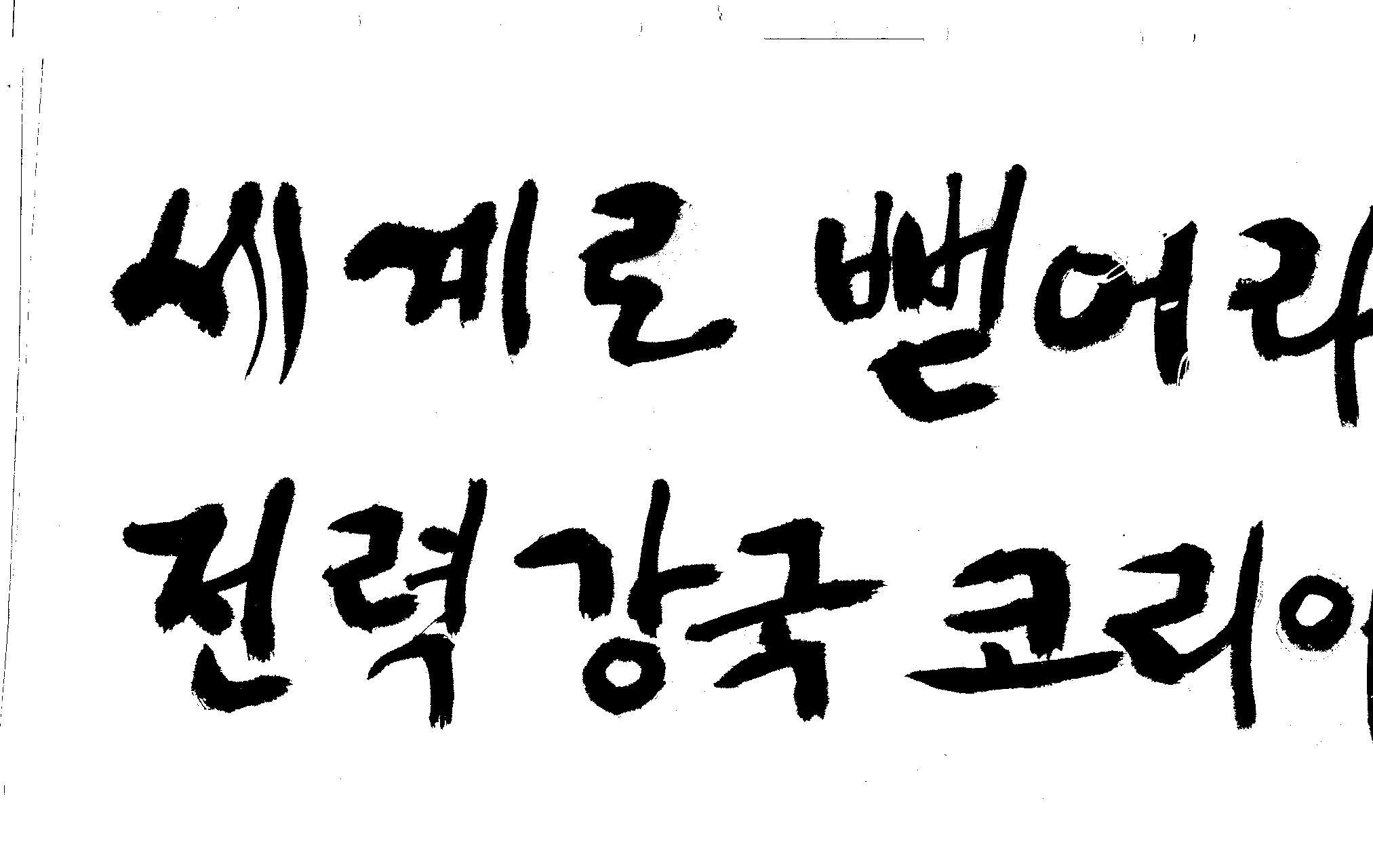 캘리 좀 부탁드려요!~ 김철호 일반 1 12671 2008.12.24 12:09 > > > > > > > > > 전력회사 신문광고를 하는데요 캘리로 멋지게 하고픈데 > > > 캘리프로그램으로 아무리 써도 느낌이 안나옵니다 ㅜ.ㅜ > > > 이런걸 부탁한다는 자체가 너무나도 염치없지만 부탁드립니다. > > > > > > 세계로 뻗어라! 전력강국 코리아 > > > > > 보기는 쉬워도 하기는 어려운게 > > 세상 모든 일 일겁니다. > > 그중에 캘리그라피가 그런 것일 겁니다... > > 스캔중에 글꼴이 잘린것은 서로다른글꼴서 편집하시길... > > 글수가 많아서 어쩔 수없네요... > > >